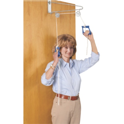 Easily fits over a standard door.  Comes complete with door bracket, pulleys, cord, and handles.  For use when sitting or standing.
